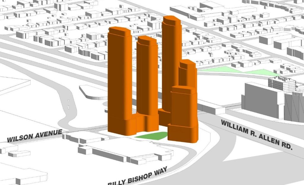 This development proposal from Manulife would eliminate essential neighbourhood shops near Wilson Station and replace them with five towers up to 49 storeys tall.